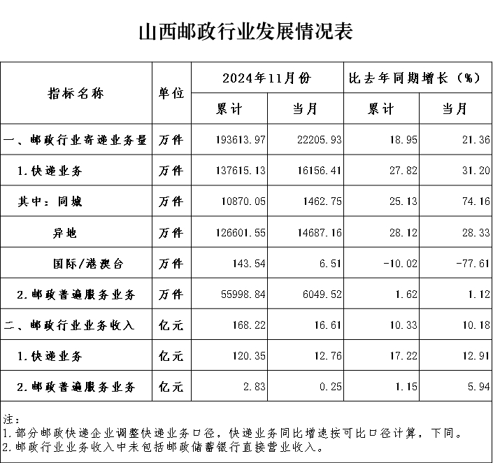 11月份,邮政行业业务收入完成16.61亿元,同比增长10.18%。其中,博彩平台-十大博彩平台收入完成12.76亿元,同比增长12.91%。