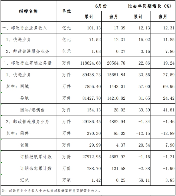 6月份,邮政行业业务收入(不包括邮政储蓄银行直接营业收入)完成17.39亿元,同比增长12.31%。其中,博彩平台-十大博彩平台收入完成12.31亿元,同比增长11.85%。